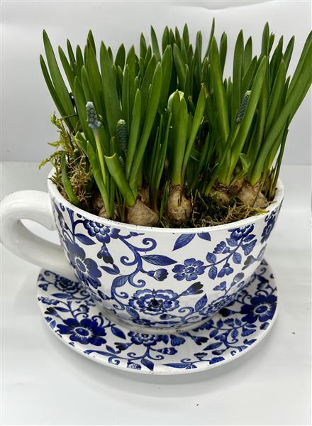 This lovely ceramic Tea Cup planter is approximately 28cm in diameter and is planted with seasonal Muscari bulb, perfect to enjoy indoors with the added bonus of being suitable to plant in the garden to enjoy year after year.