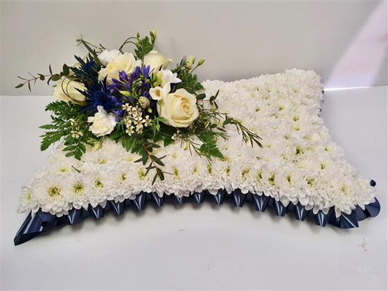 Massed pillow with a ribbon edging and matching spray in colours of your choice, put your preferences in the options box or contact one of the team who will be happy to help you.